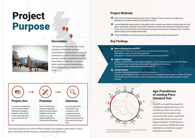 The purpose of the study is to involve members of the public in developing a useful, freely accessible and user-friendly standardised tool. The tool aims to identify the most important factors that would allow people to ‘age in place’ (AiP). Ageing in Place means being able to remain at home and connected to your community as you get older. Such a standard tool could be of potential benefit to policy-makers, designers, third-sector partners (e.g., age-related charities) and communities themselves. The outcomes of this study will be used to support a more substantial national or international grant application that will carry the research to the next level.