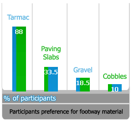 We chose 4 contrasting types of footway material and asked participants their preference as a walking material. They were allowed to select none or up to all 4 types.