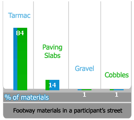 Typically our participant’s street is made of tarmac (84%) or similar smooth material. Paving slabs are used on 14% of streets, with cobbles and gravel each on 1% of streets. At the neighbourhood scale, this changes significantly with 48% of footways being made from non smooth materials such as paving slabs or similar, or a combination of smooth / non smooth materials.